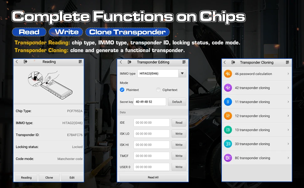 You are able to use this function to detect the transponder and vehicle information in order to decrypt a code which shall be used to directly clone and generate a functional transponder for your vehicle. The whole process saves the trouble of using the old OBD approach.
