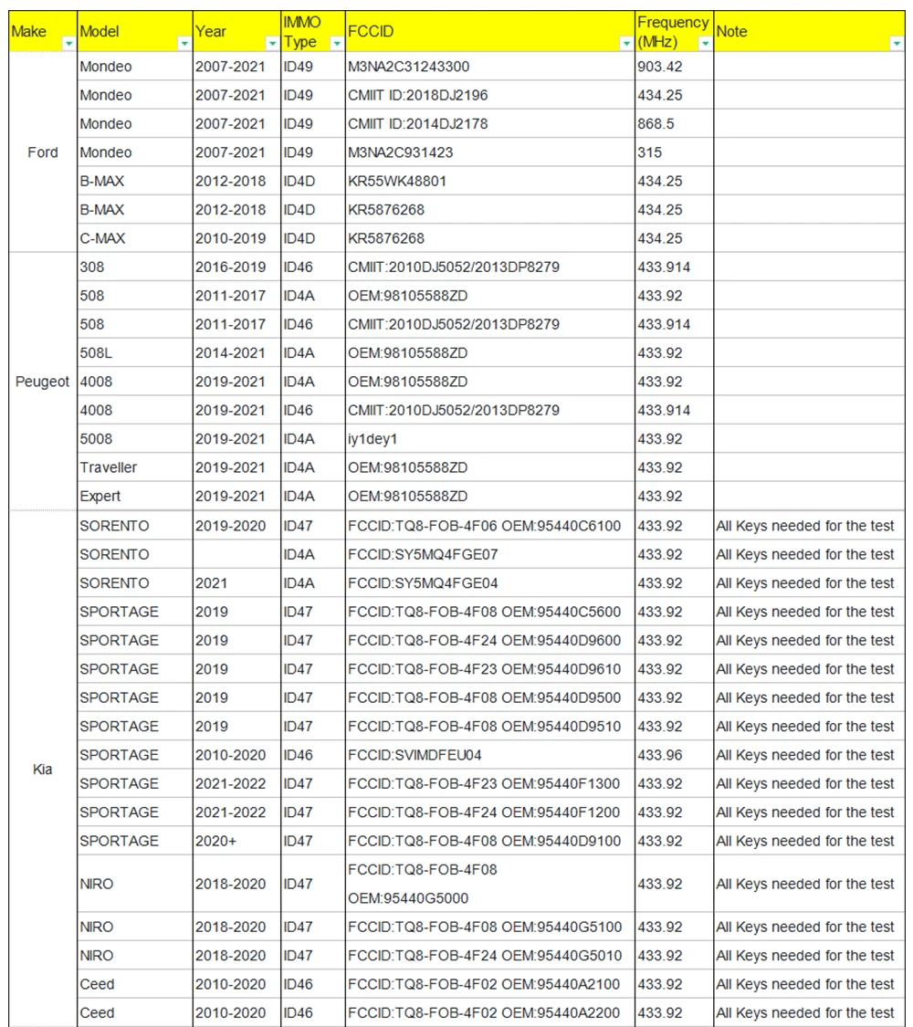 Autel MaxiIM KM100 Supported List: